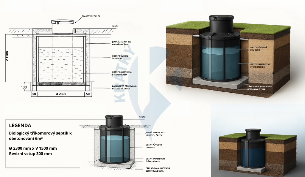- septik o objemu 6m³ nabízí dostatečnou kapacitu pro větší domácnosti či menší podniky, což zajišťuje efektivní provoz bez časté údržby.